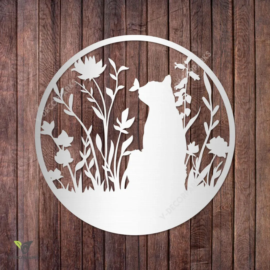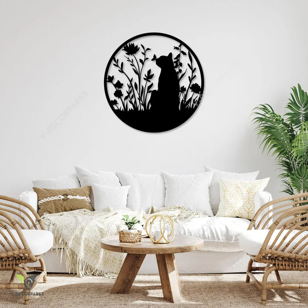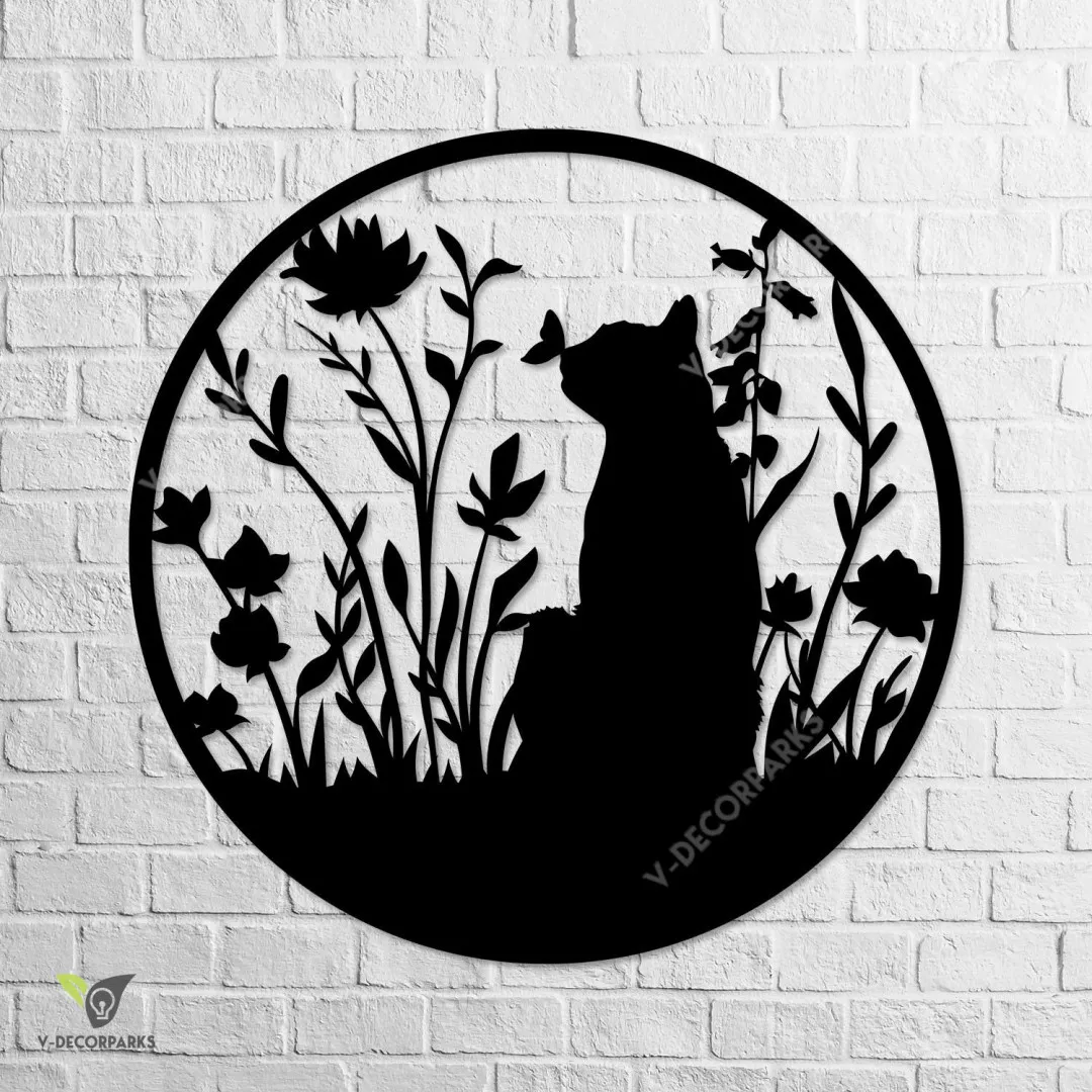 Cat, Butterfly And Flowers Circle Metal Sign, Cat Bedroom Wall Hanging