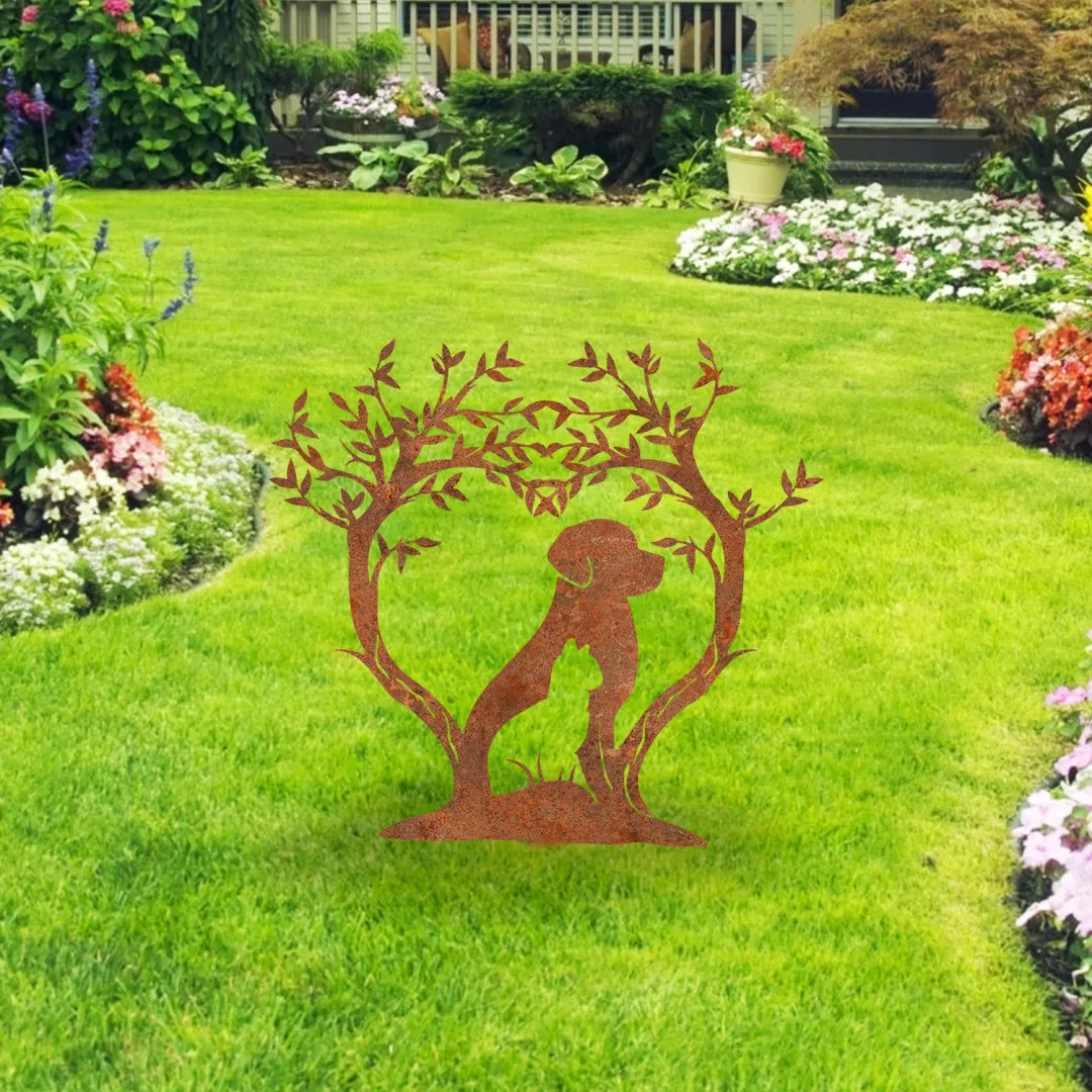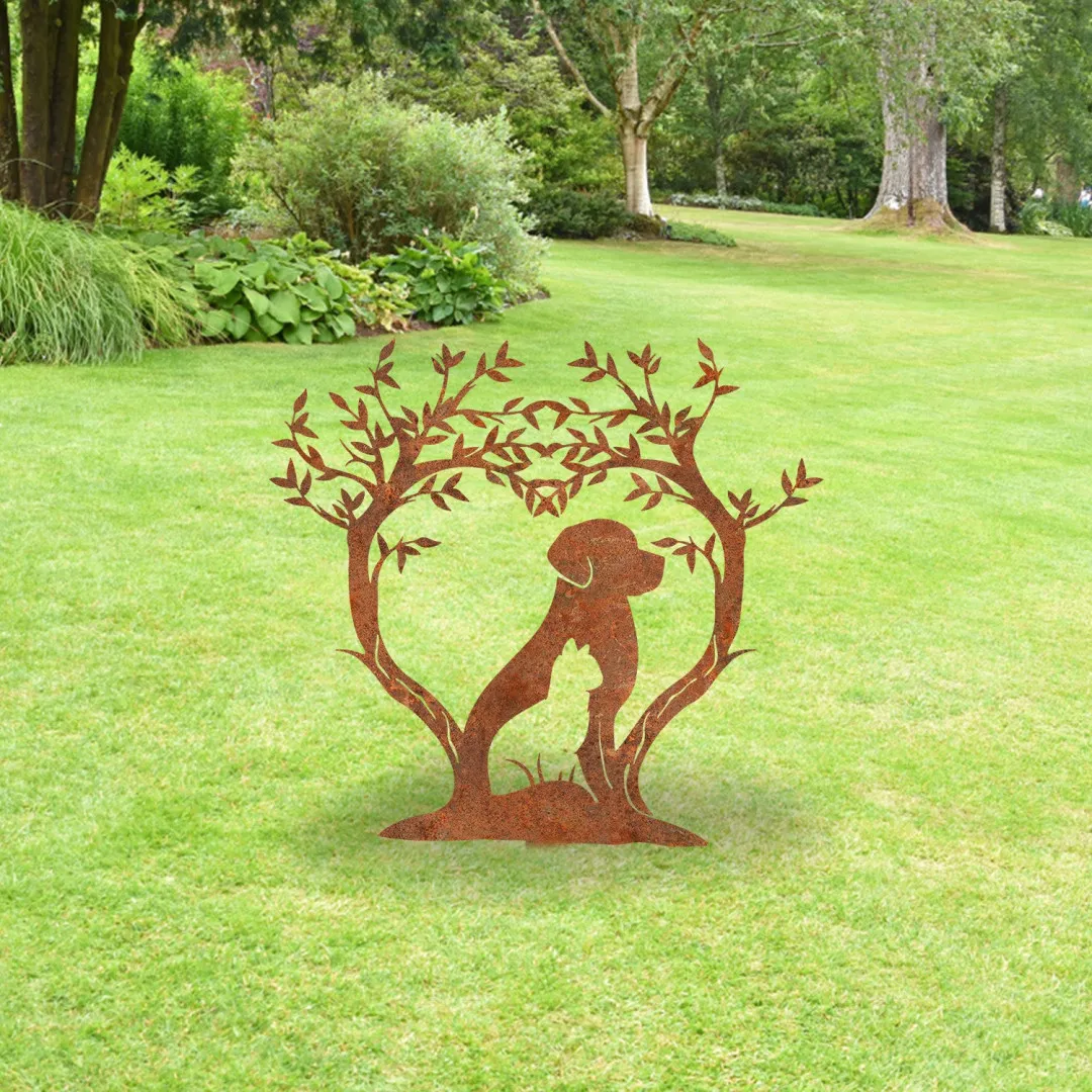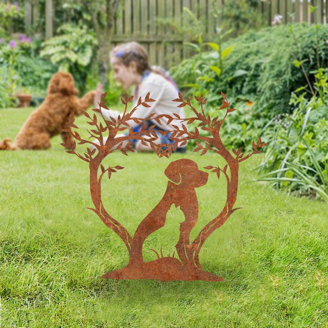 Cat Inside Dog With Heart Trees Rustic Metal Garden Decoration, Pet Yard Stake