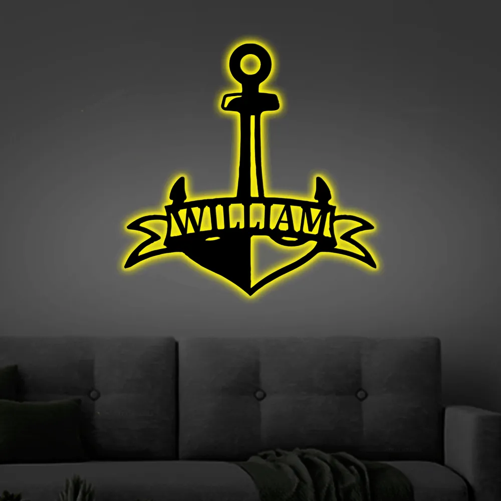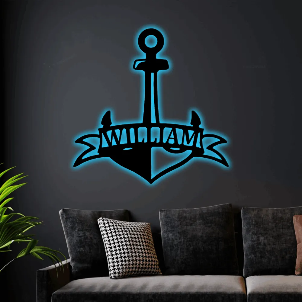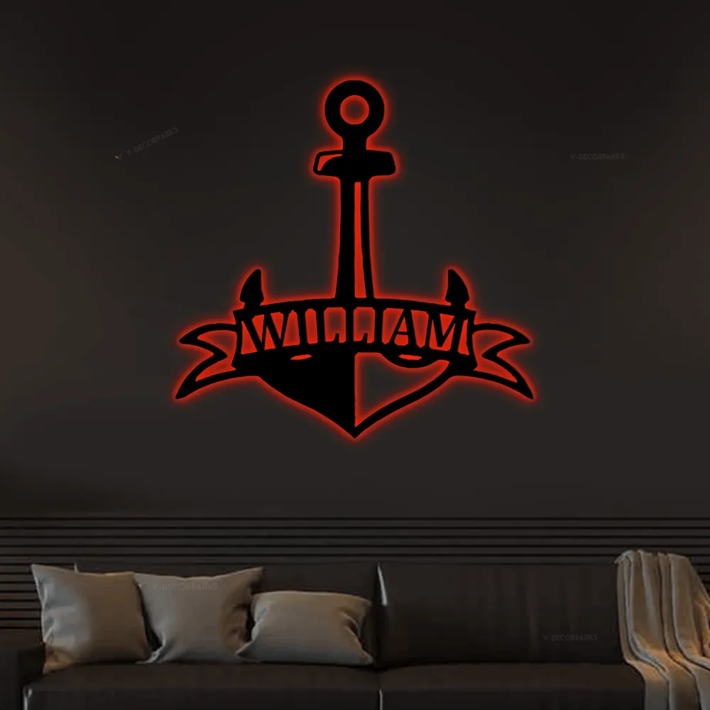 Custom Anchor With Led Lights Sign Monogram Steel Sign, Personalized Fancy Anchor Nautical Monogram Wall Art Decor Beach House Wall Decor