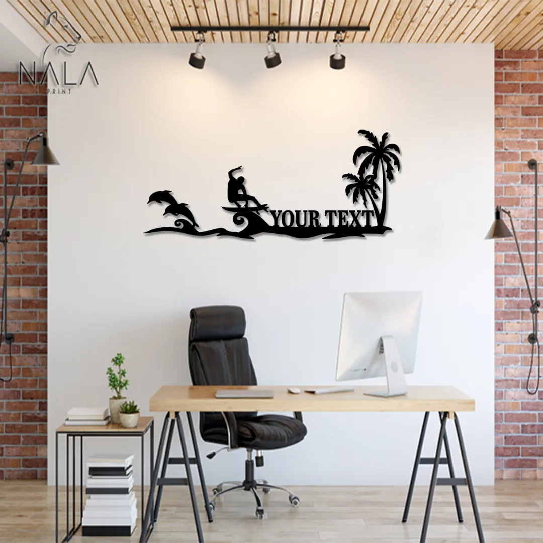 Custom Beach Surfing With Dolphins Cut Metal Sign, Ocean Surfing With Dolphins Palm Tree Metal Wall Art