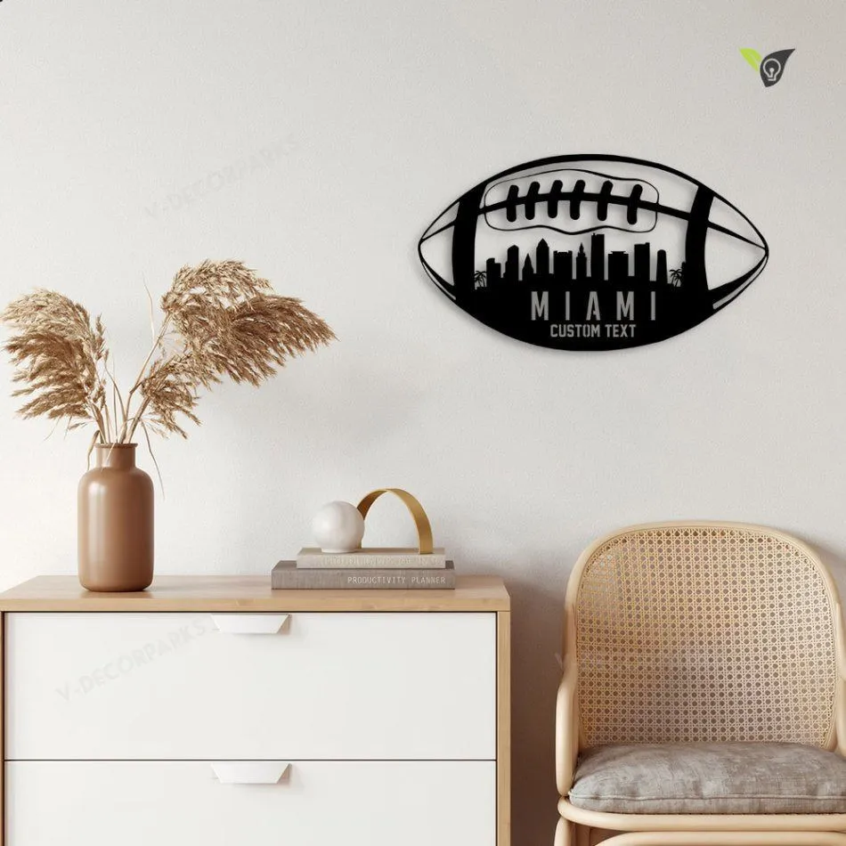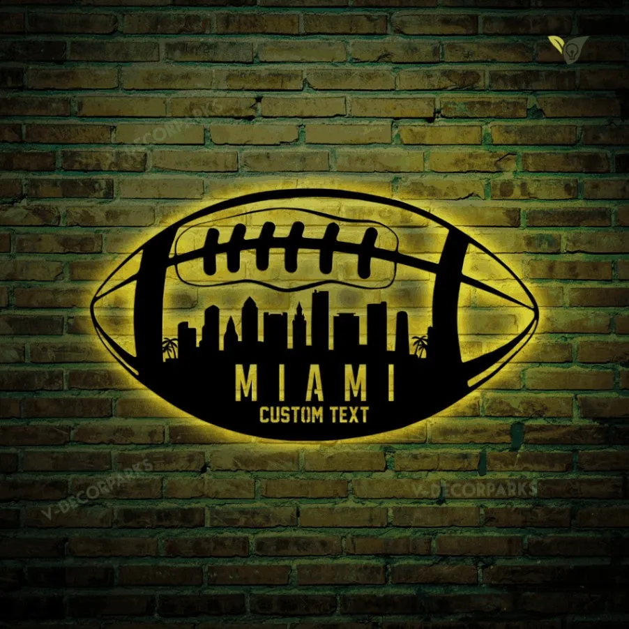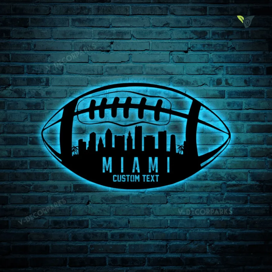 Custom Football Miami Skyline Metal Wall Art With Led Lights, Personalized Name Football Player Metal Sign, Kid Room Decor
