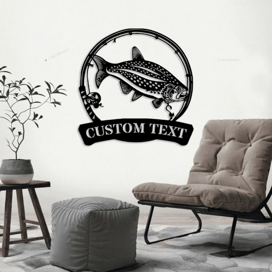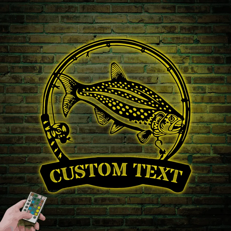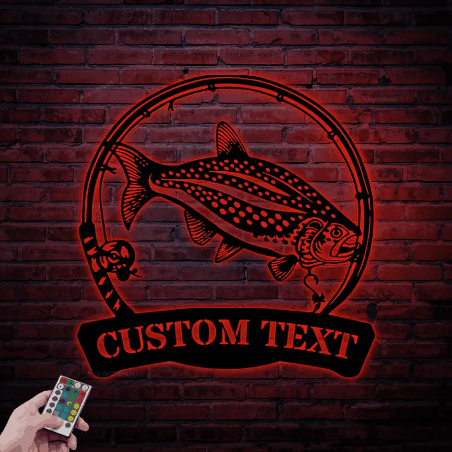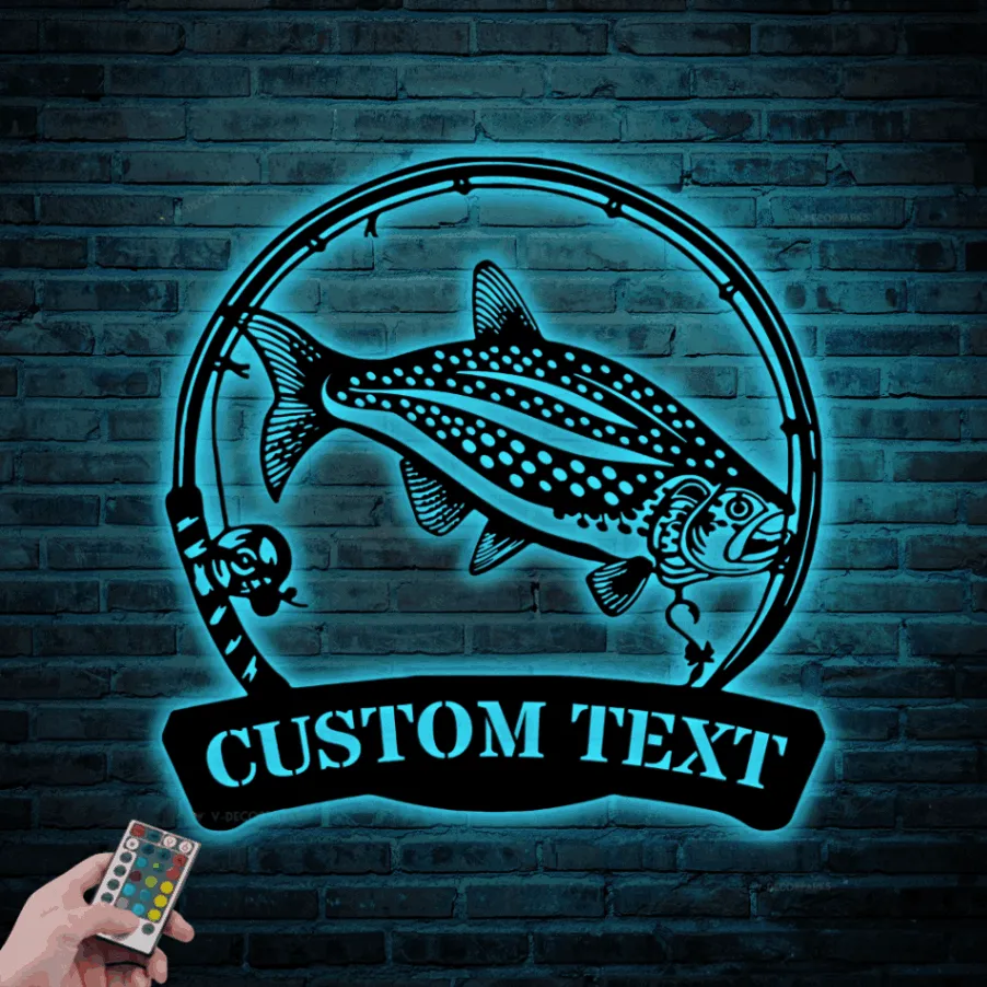 Custom Lake Trout Fishing Metal Sign Led Lights, Personalized Fisher Name Sign Home Decor Kid Boy Girl Nursery Decoration Birthday