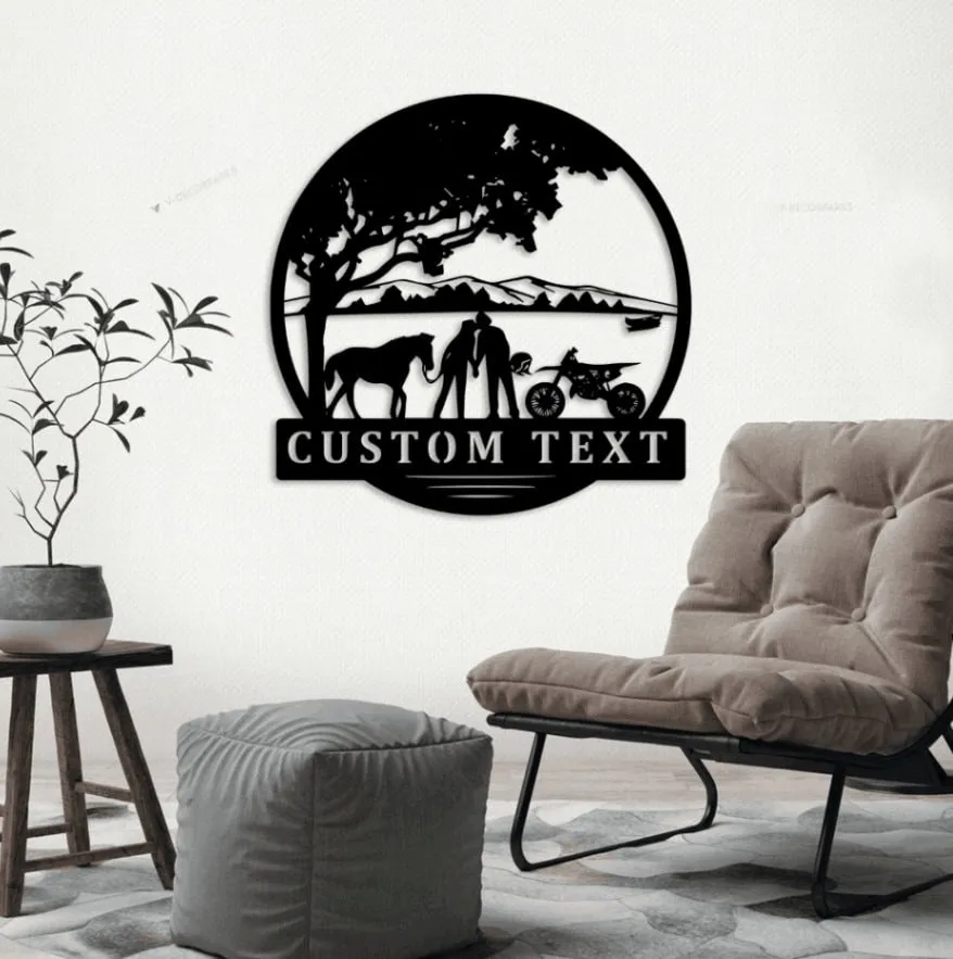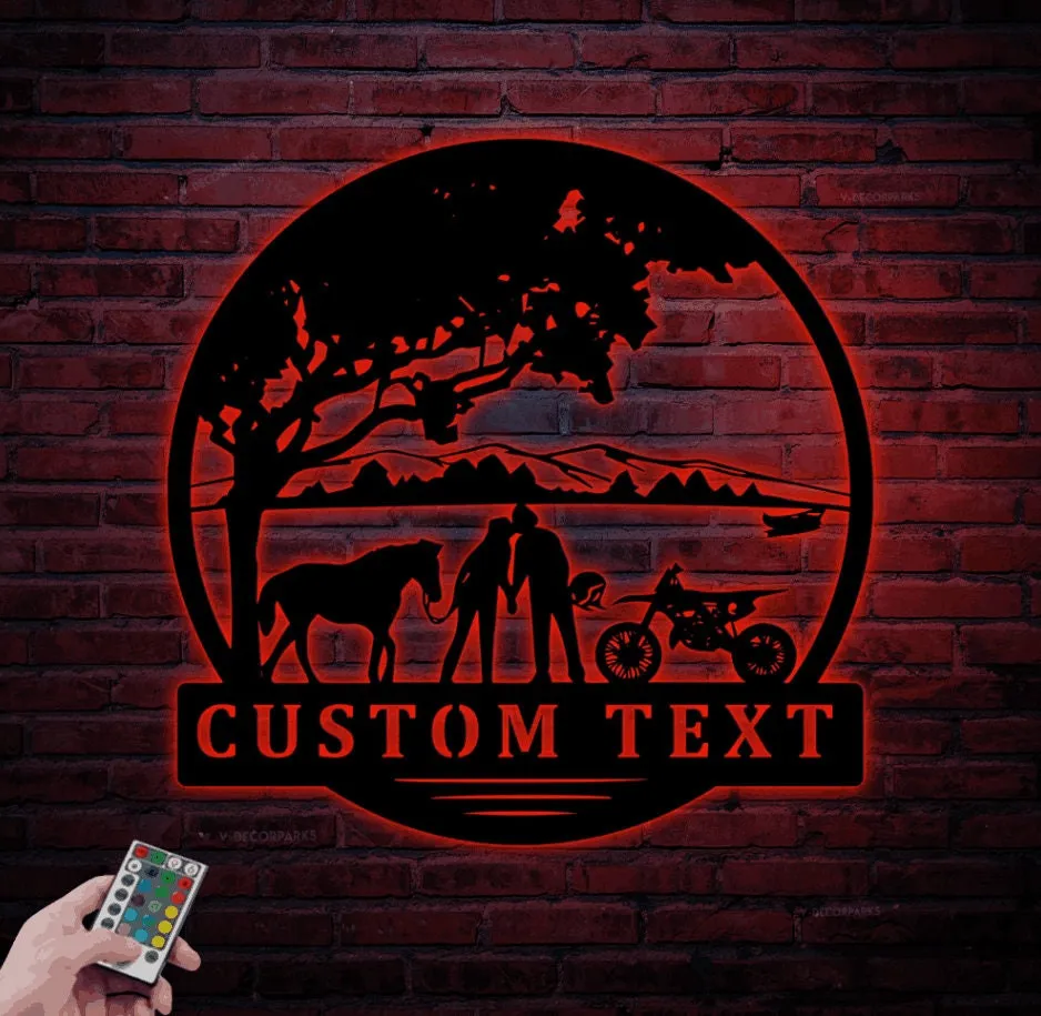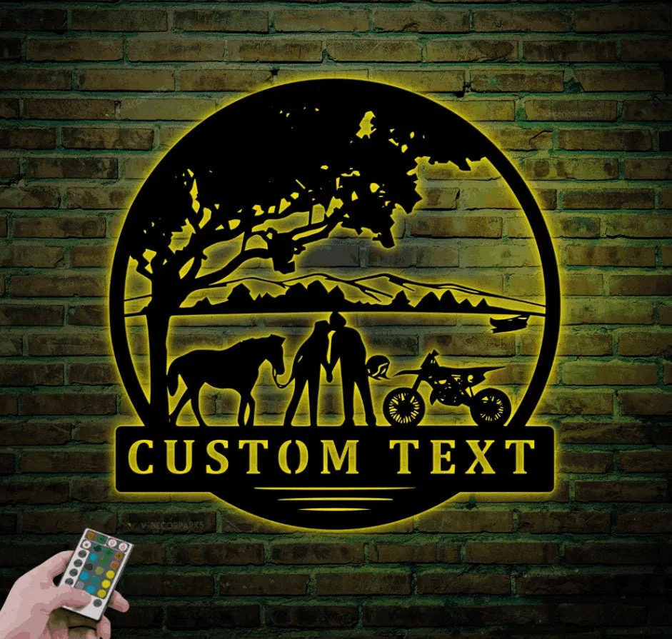 Custom Motocross Biker Cowgirl Couple Kiss Metal Sign Led Lights, Personalized Dirt Bike Name Sign Home Decor Motorcycle Horse Rider Xmas