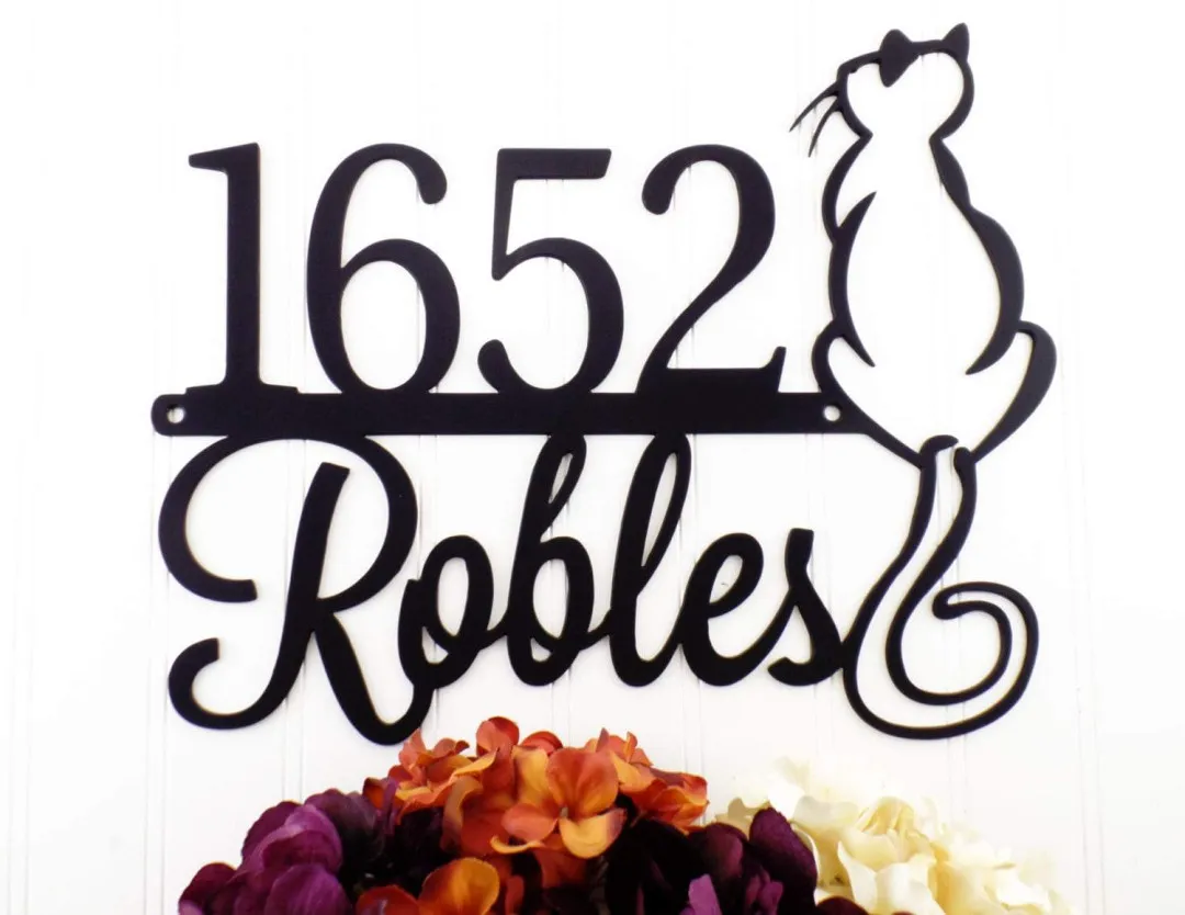 Custom Outdoor Cat House Number Family Name Metal Sign – Black, Family Last Name, Outdoor Sign