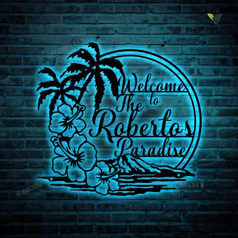 Custom Palm Tree Flowers Welcome Metal Sign With Led Light, Personalized Patio Family Name Sign Home Decor Backyard Beach House