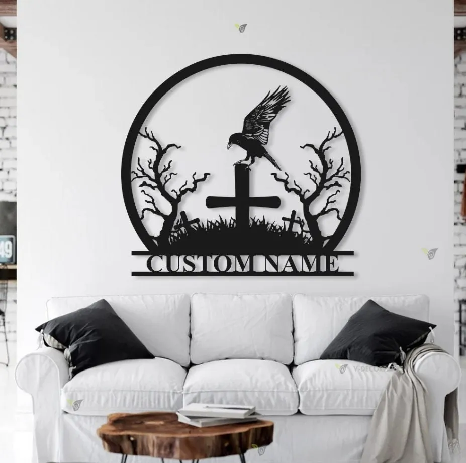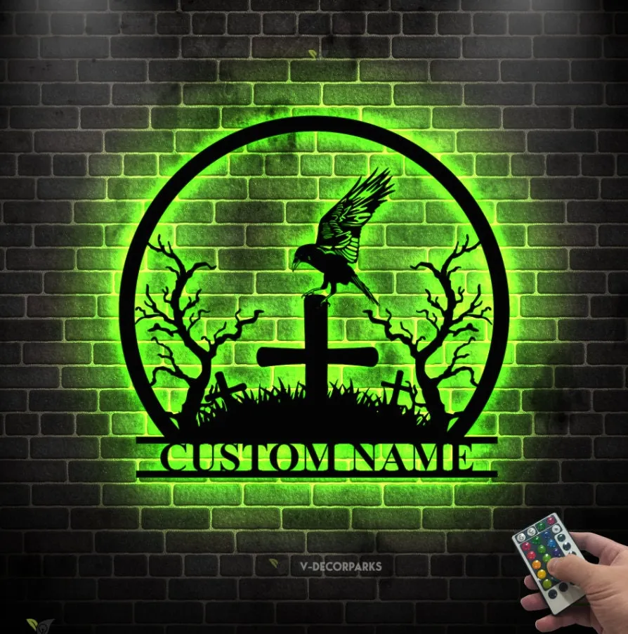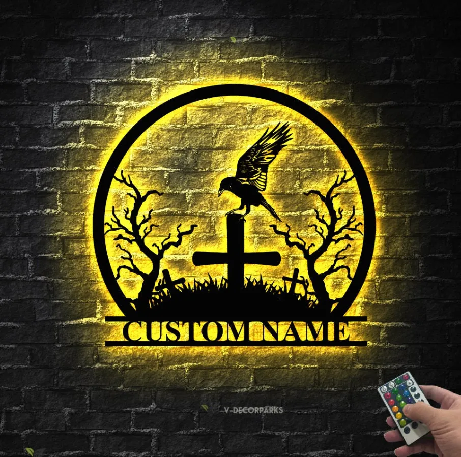 Custom Raven Metal Wall Art Led Light Black Horror Bird Decoration Man Cave Hanging Door Personalized Crow Moon Name Sign Home Decor