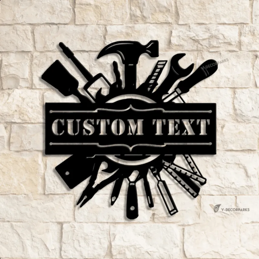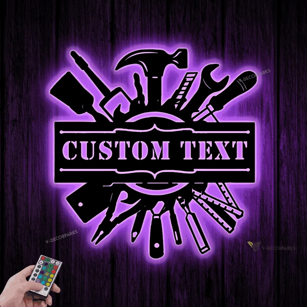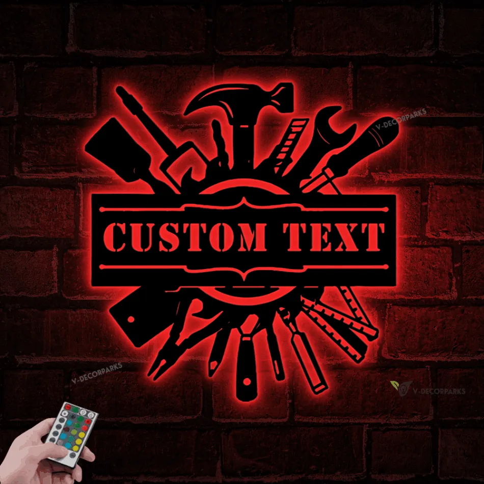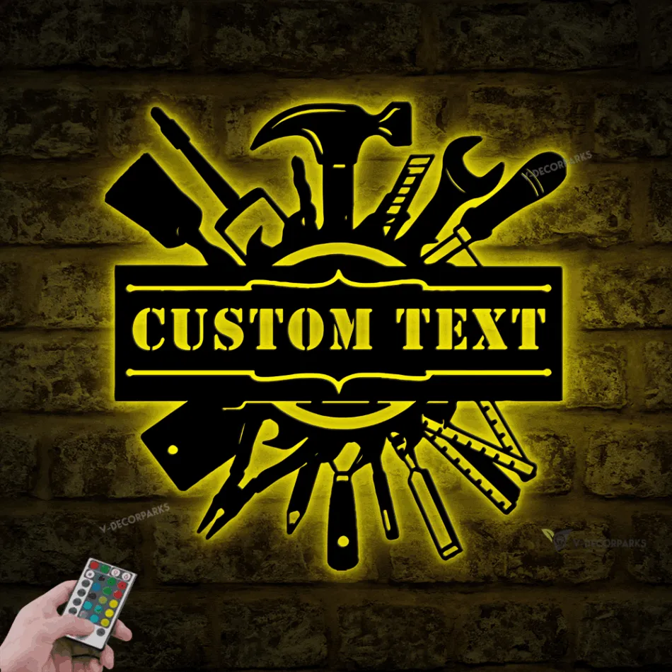 Custom Tools Repair Metal Wall Art Led Light, Personalized Builder Workshop Name Sign, Constructor Decoration, Repairman Gift, Custom Metal Sign