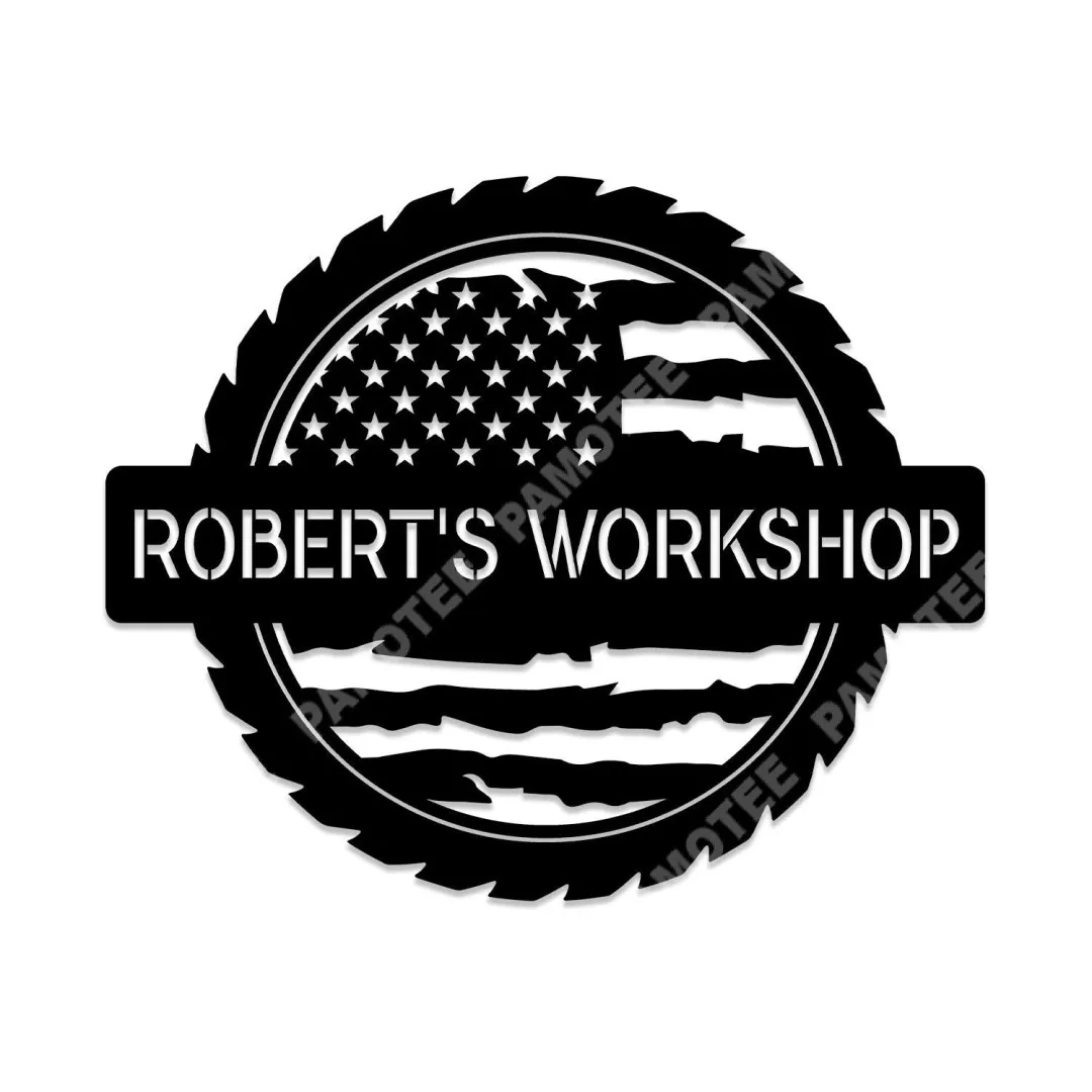 Custom Workshop With American Flag Steel Plaque, Metal Wall Hanging Garage