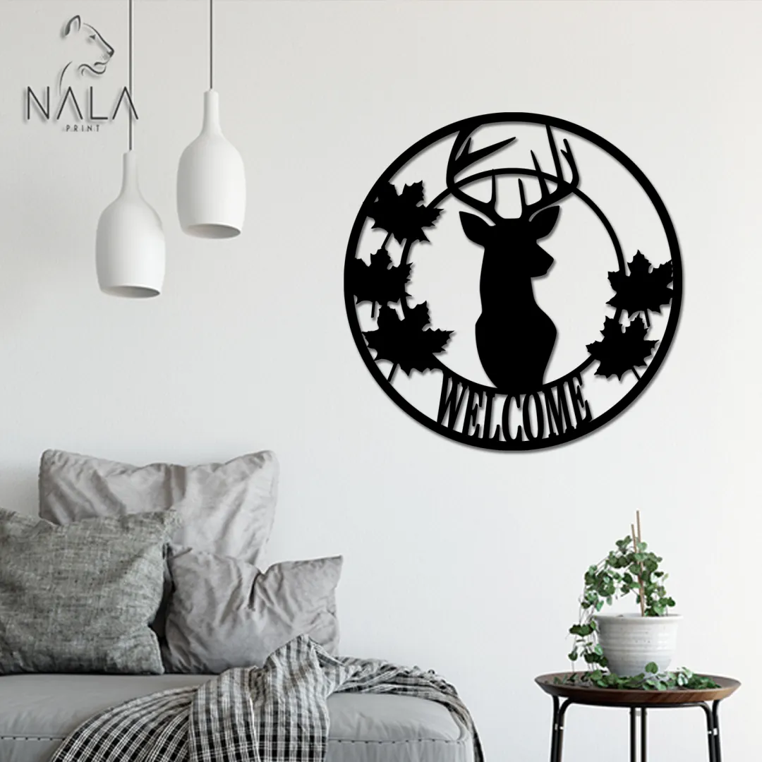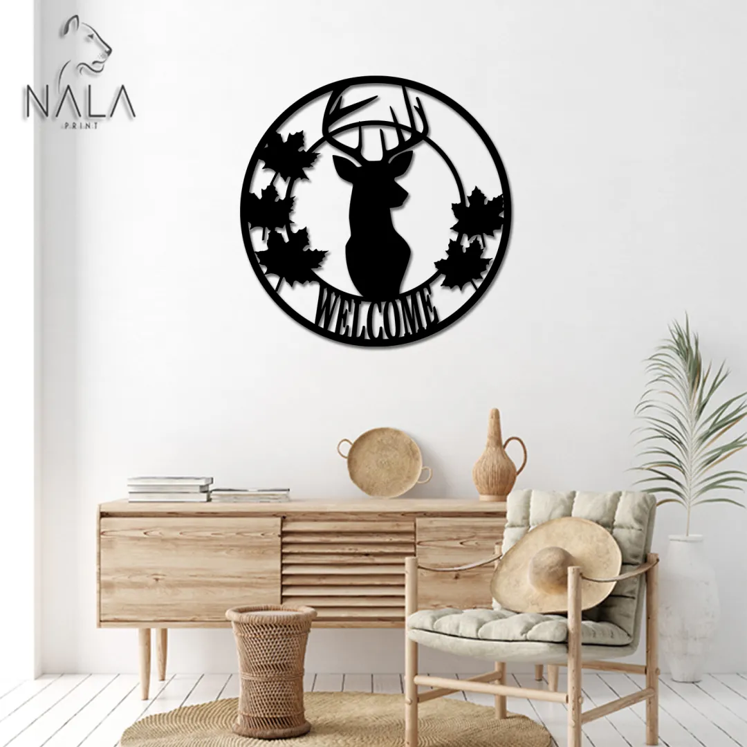Deer And Maple Leaves Welcome Metal Sign, Deer Wall Art Decor, Wild Animal Wall Hanging, Metal Wall Art