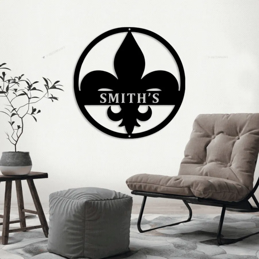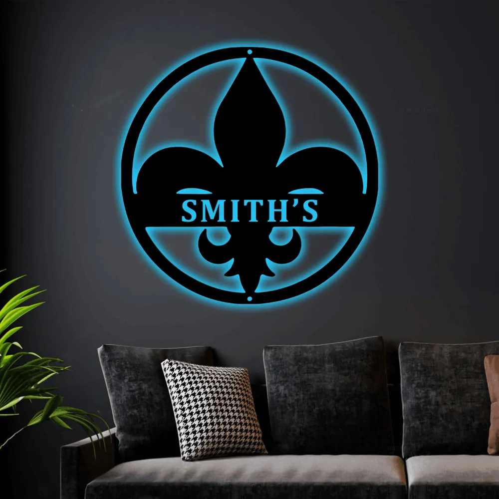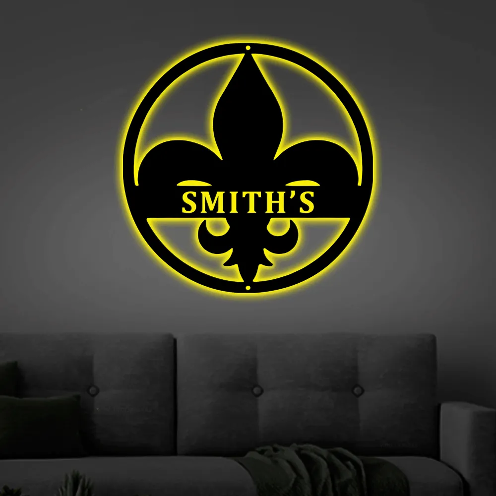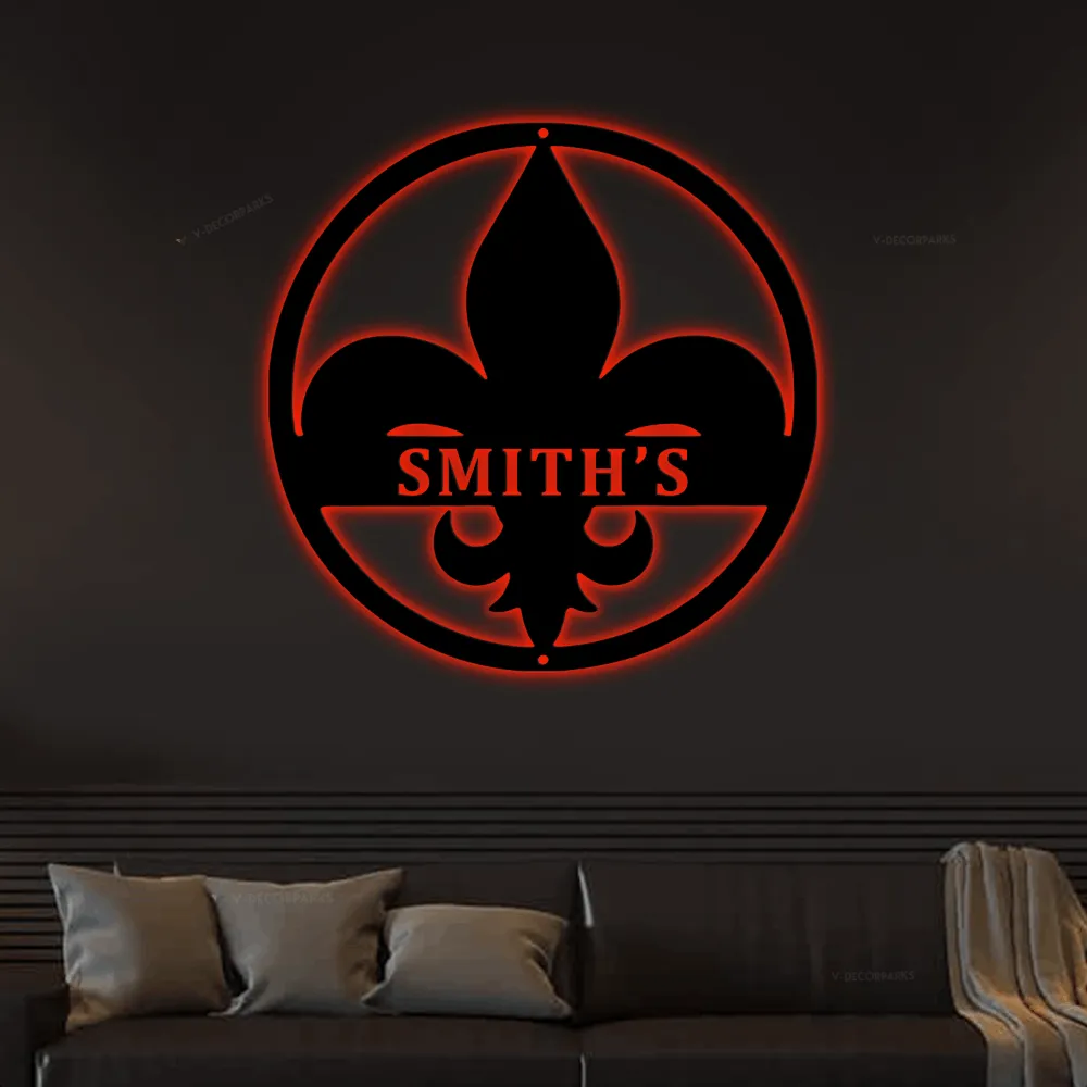 Fleur De Lis Led Lights Monogram Steel Sign, Customized Fleur De Lis Monogram Wall Art Home Wall Decor Personalized Gift