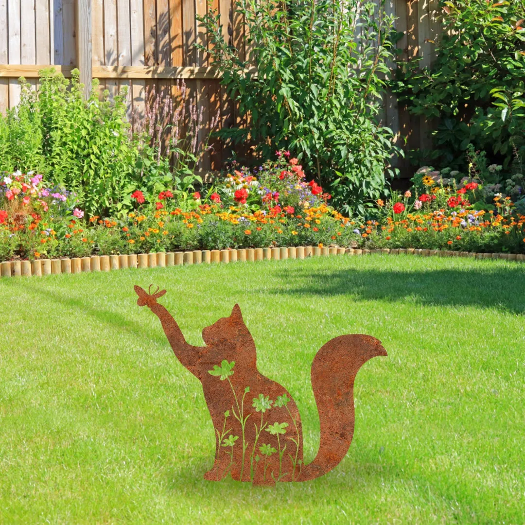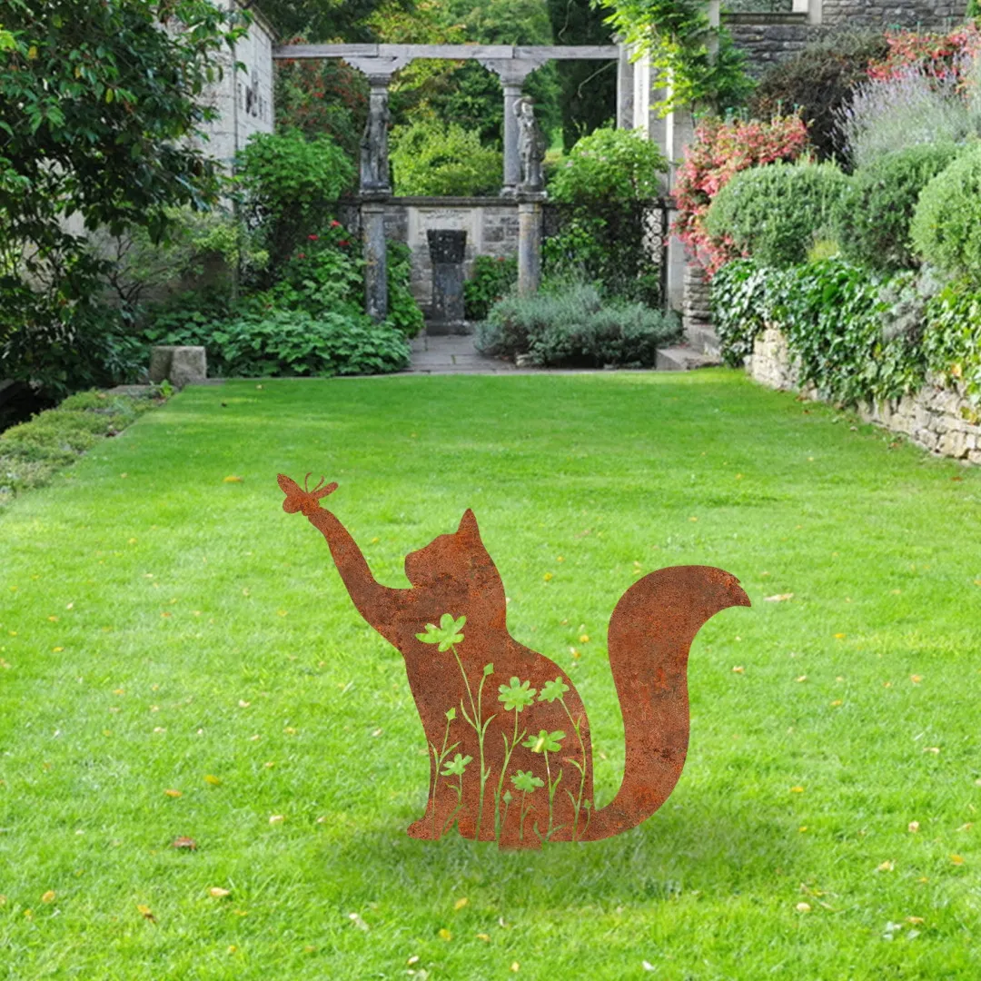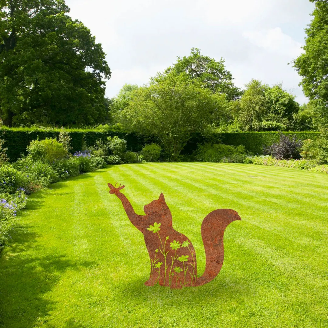 Floral Cat Playing With Butterfly Rusted Metal Garden Decoration, Cute Cat Steel Sign