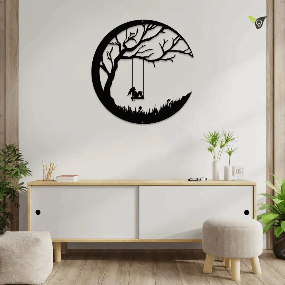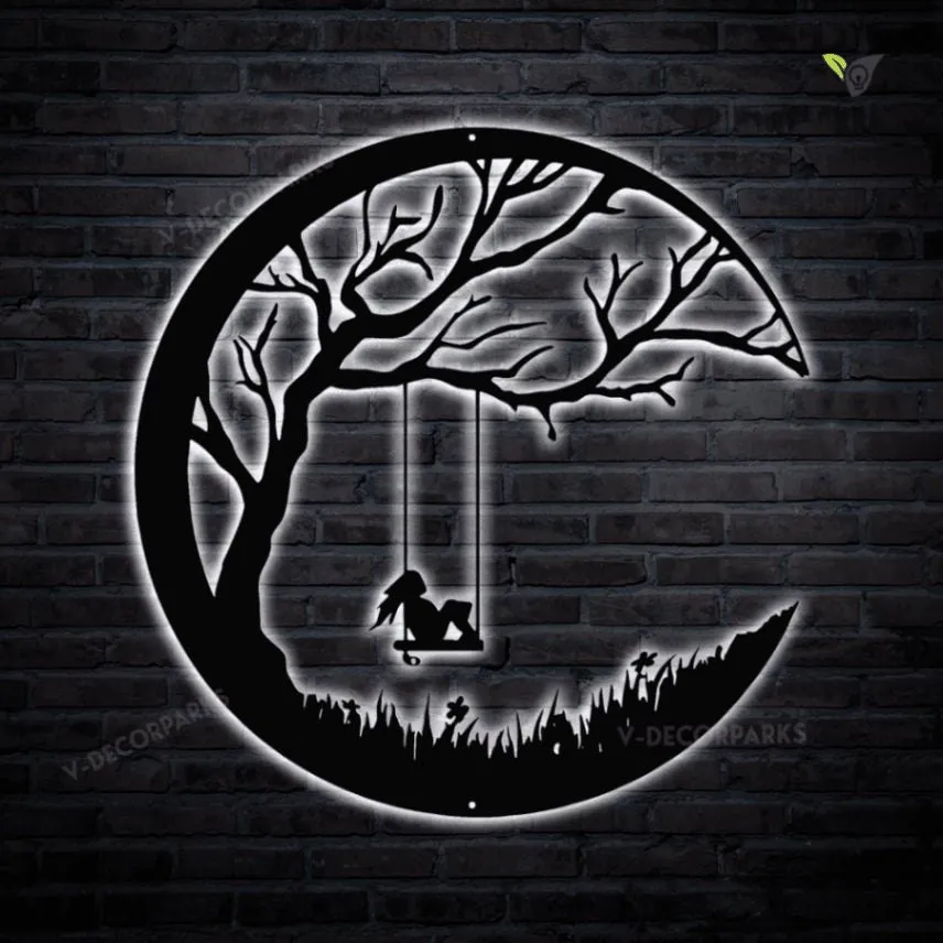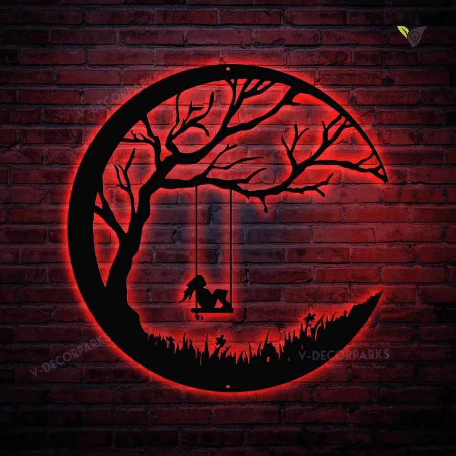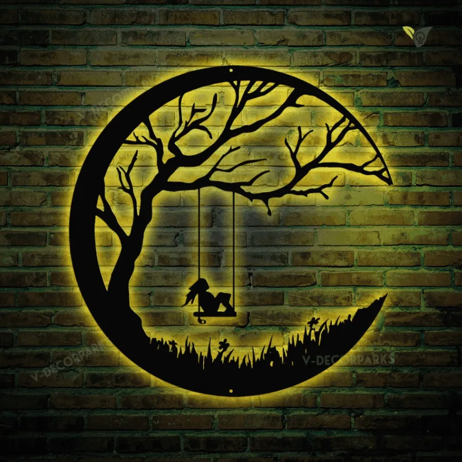 Girl On A Swing Moon Night Metal Sign With Colorful Led Light, Girl With Moon Metal Wall Art, Girl On A Swing Home Decor, She Shed Metal Art