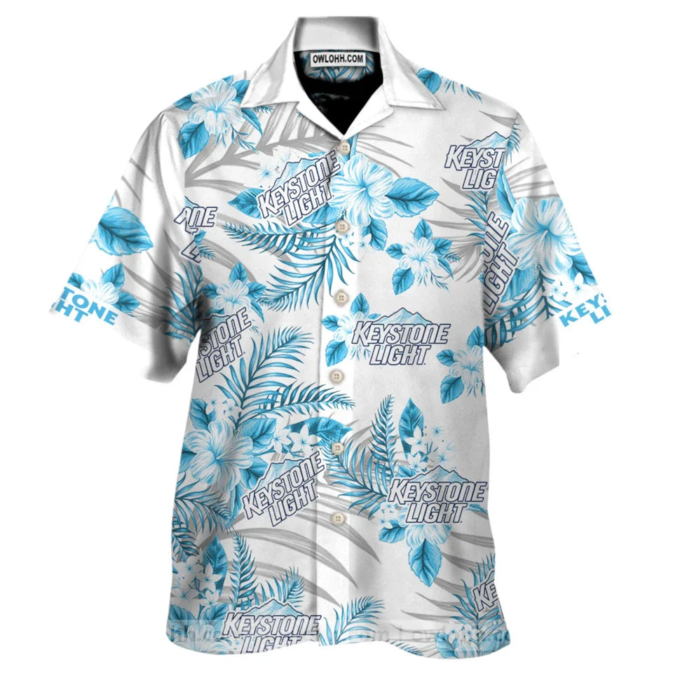Keystone Light Hawaiian Shirt For Men – Blue Tropical Floral White – Summer Beach Vacation Gift