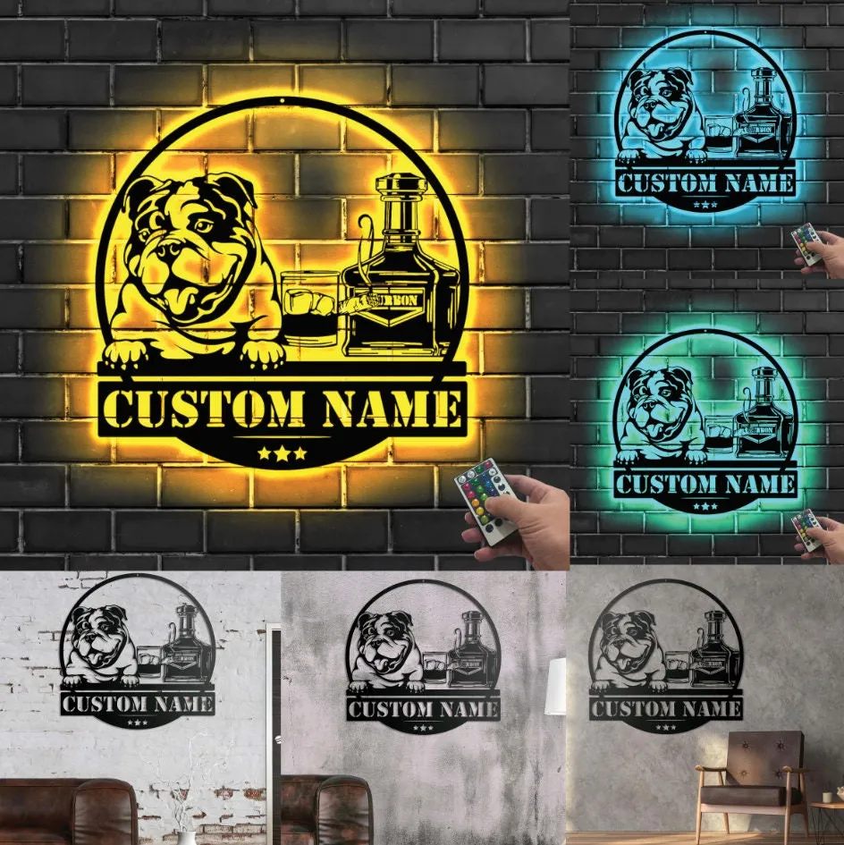 Metal Sign Led Lights, Custom Bourbon Cigar And Bulldog Metal Sign, Personalized Alcohol Smoke Sign, Home Bar Pub Decor Dog Decoration
