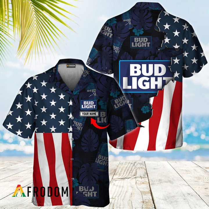 Personalized Bud Light Hawaiian Shirt For Men – Tropical Monstera American Flag – Patriotic Summer Gift