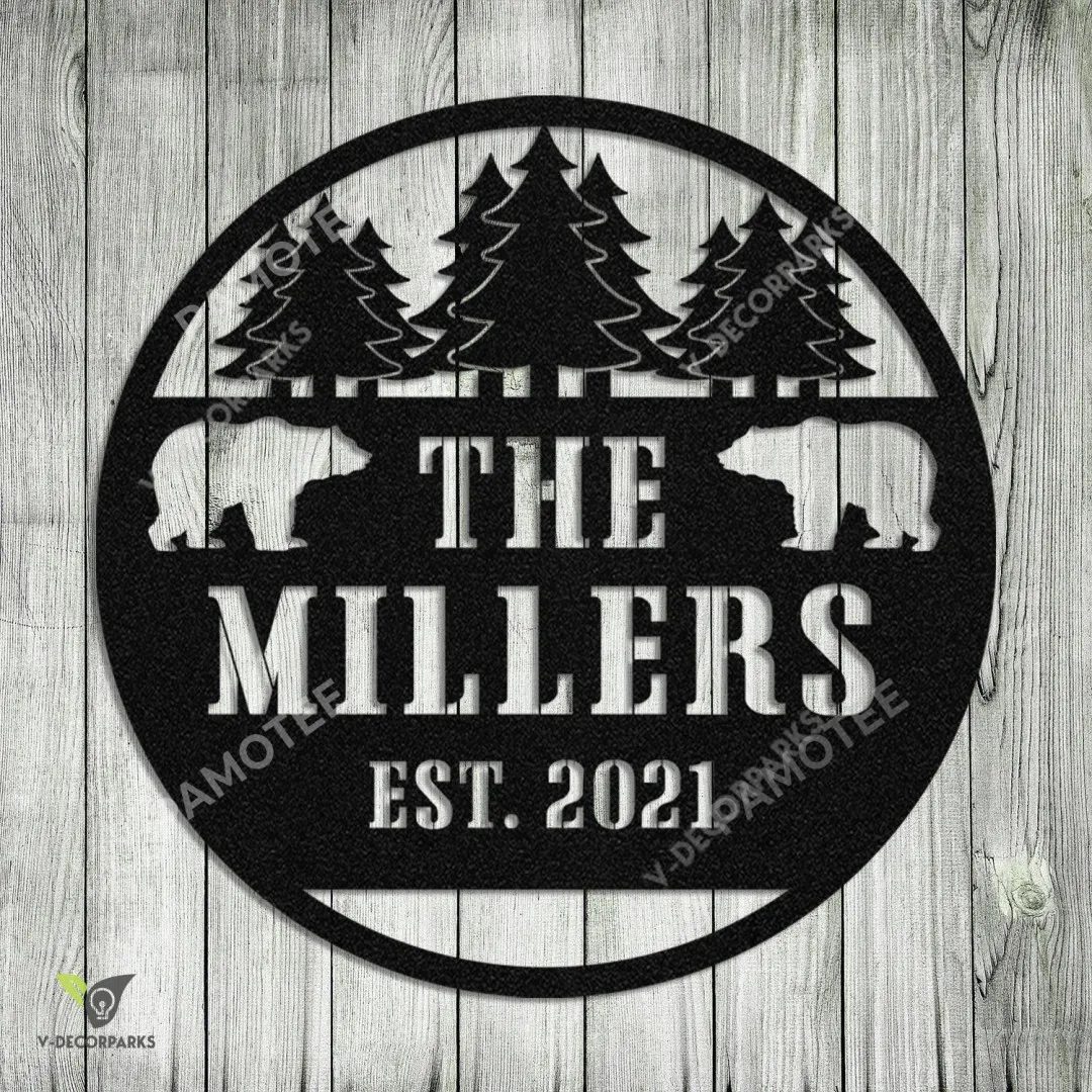 Personalized Family Name Bear And Pine Tree Forest Hanging Sign, Metal Wall Art, Front Door Decor