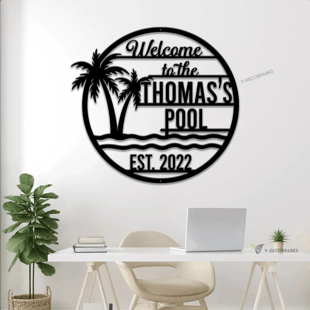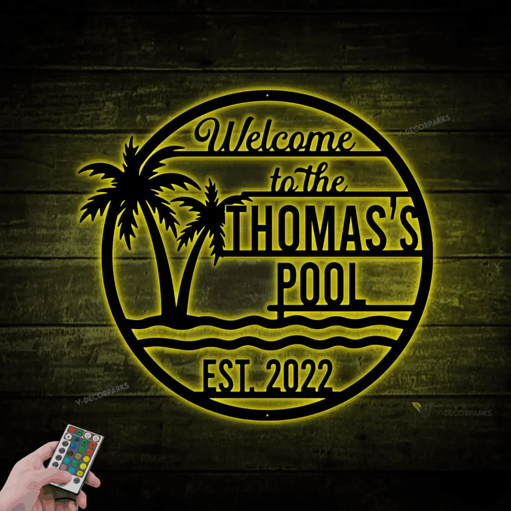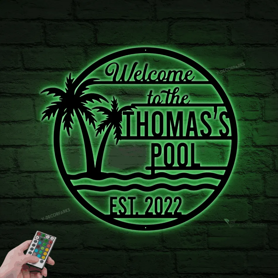 Personalized Pool Palm Tree Metal Wall Art With Led Lights, Custom Family Palm Tree Pool Family Name Metal Sign, Swimming Sign