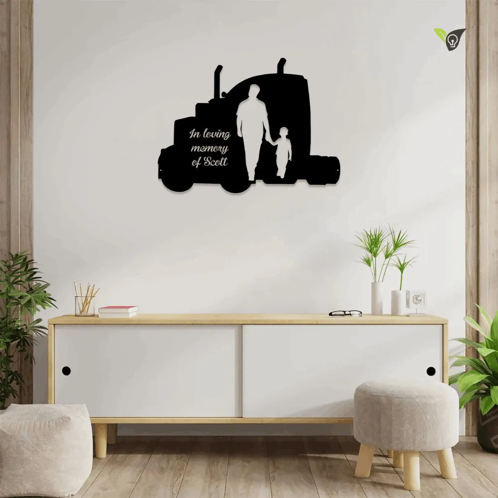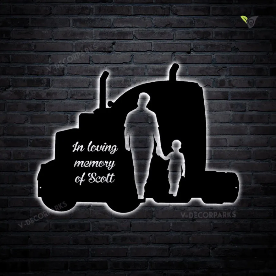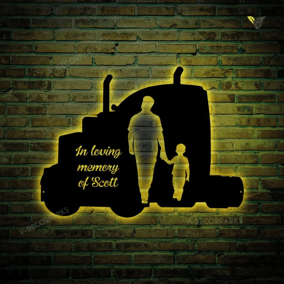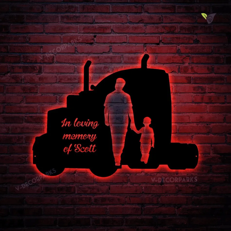 Personalized Trucker Dad And Son Metal Sign With Colorful Led Light, 18 Wheelers Housewarming Plaque