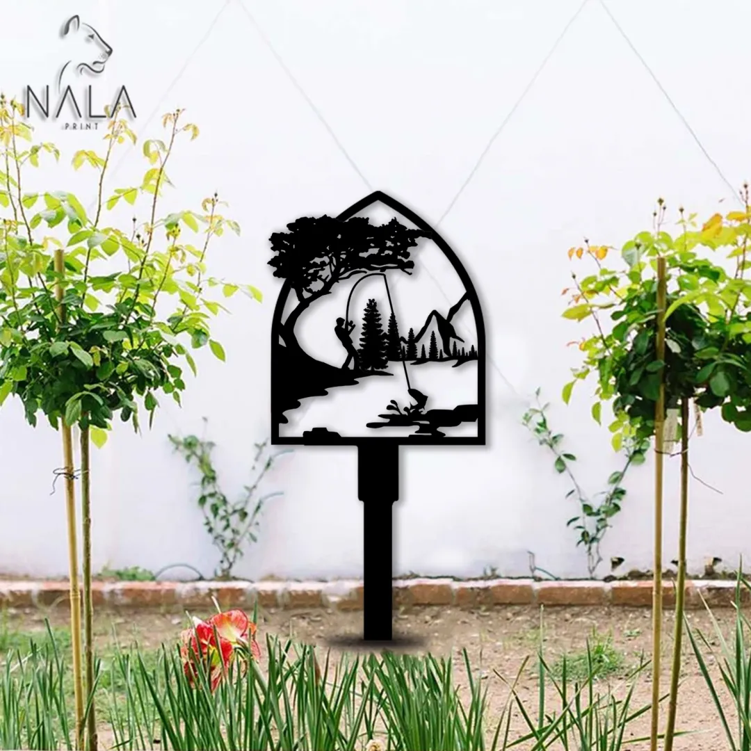 Shovel Man Catching Fish In The Woods Design Metal Garden Sign, Fishing Metal Yard Stake, Garnden Stake For Fishing Lovers