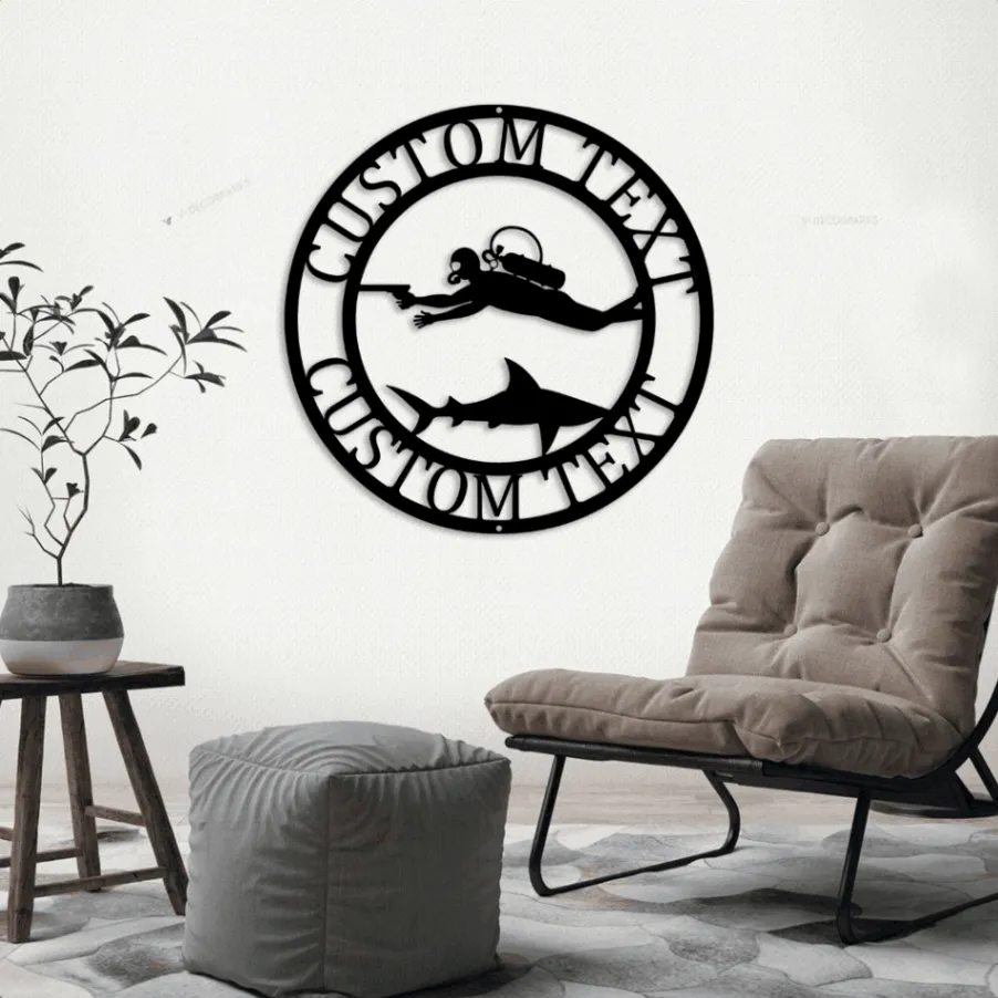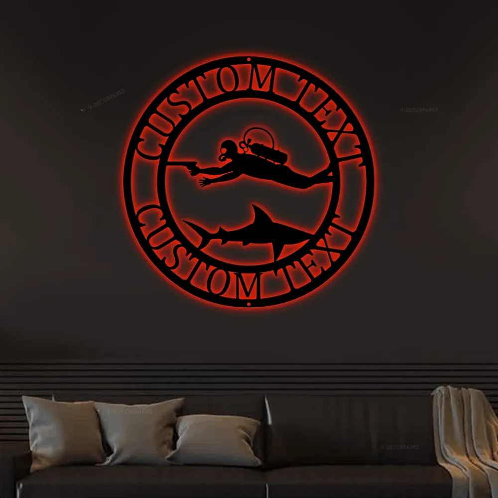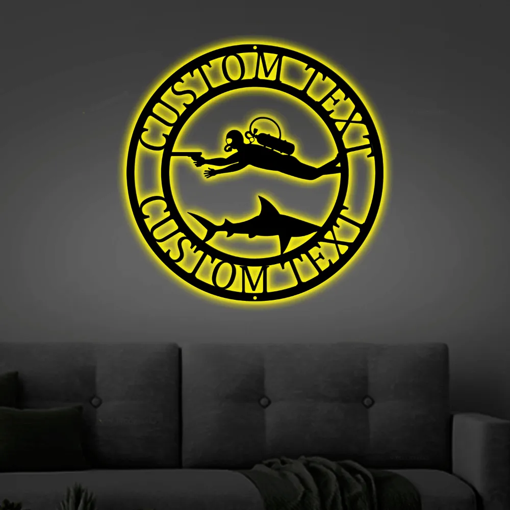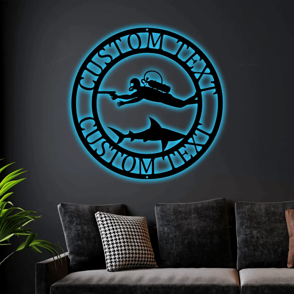 Steel Scuba Diving Led Lights Sign Home Wall Decor, Scuba Diver Housewarming Gift Beach House Decor Personalized Monogram Diver Sign